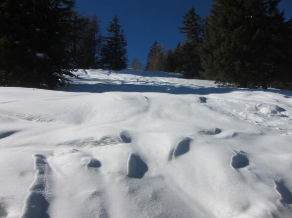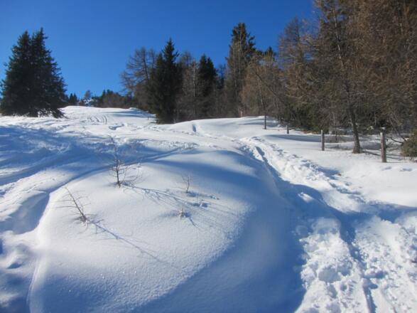 Der unterste Teil durch den steilen Wald wird bequem auf einer Forststraße überwunden, dann folgen Mähder, die herrlichen Skigenuss bedeuten und schlussendlich ein breiter, latschenbewachsener Rücken, der zum Gipfel führt.