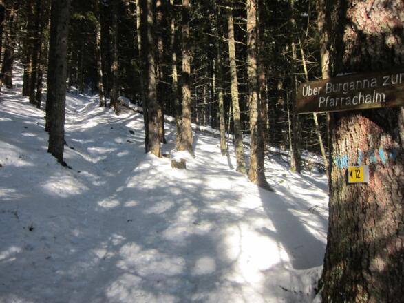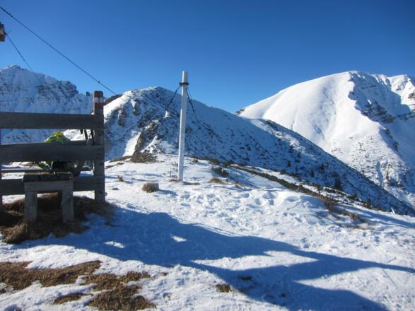 Die ersten paar Meter folgen wir der Rodelbahn in Richtung Pfarrachalm. Schon nach ein paar Minuten zweigt rechts recht eben der beschilderte Forstweg Richtung "Jochkreuz" ab. Auf diesem Weg geht es nun weiter - immer Richtung Osten. Ebenfalls beschildert zweigt dann nach ca. 30 min. links der steilere Sommerweg Richtung Burgannamahd ab. Wir erreichen diese Wiesen, die teilweise etwas versetzt sind und steigen direkt empor, wobei wir immer wieder einen Forstweg kreuzen. Ein etwas steileres Stück wird überwunden und wir gelangen auf einen breiten Rücken mit einem Wegkreuz (Mittlat Isse). Danach geht es das nächste Steilstück hinauf - am besten dem Sommerweg (Markierung an den Bäumen) folgend - und wir nehmen das Schlussstück im Latschengebiet in Angriff. Deutlich sind die Lawinenverbauungen zu sehen, deren oberes Ende wir ansteuern. Von dort führt ein letzter kurzer Aufschwung zum Gipfel.