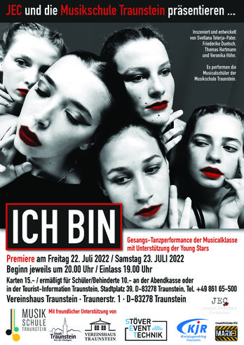 Das Junge Ensemble Chiemgau, angesiedelt im Vereinshaus Chiemgau, und die Musicalklasse der Musikschule Traunstein laden herzlich ein zu zwei Musical-Performances unter dem Titel „Ich bin“ auf der Bühne im Vereinshaus Traunstein in der Traunerstraße 1.