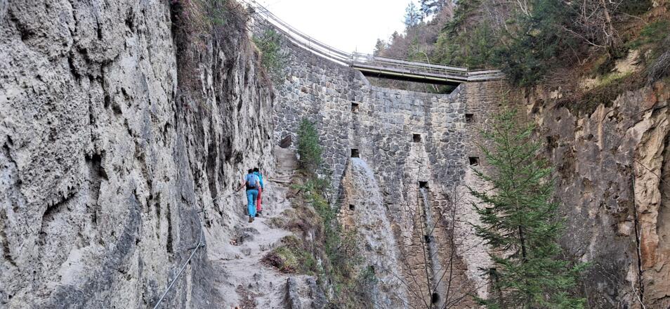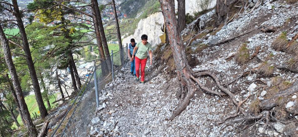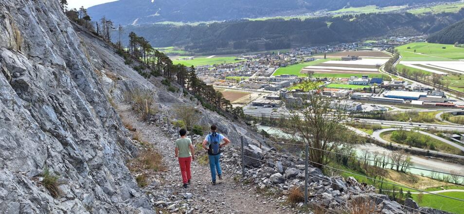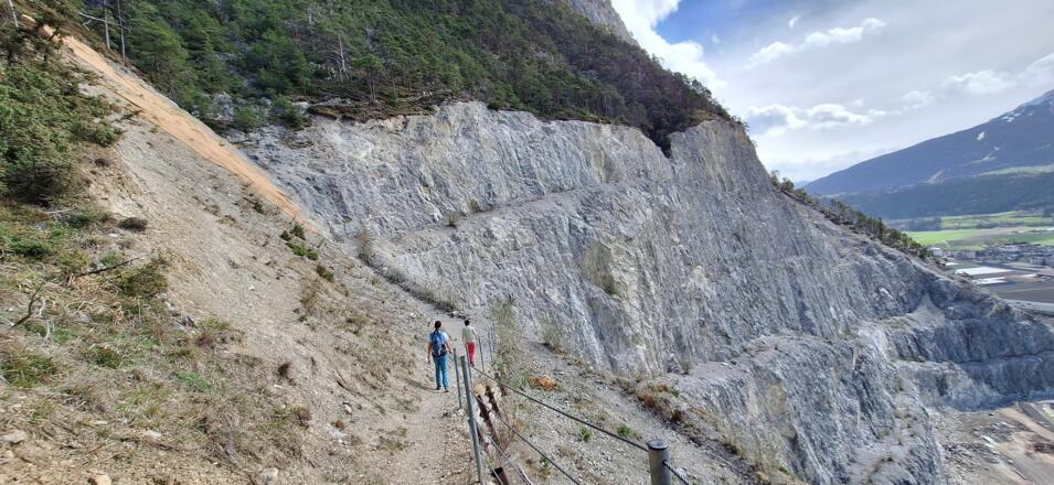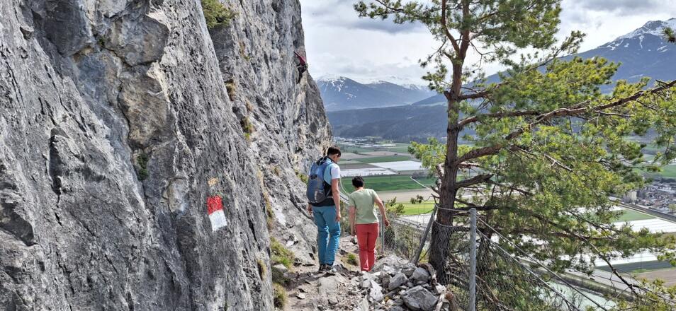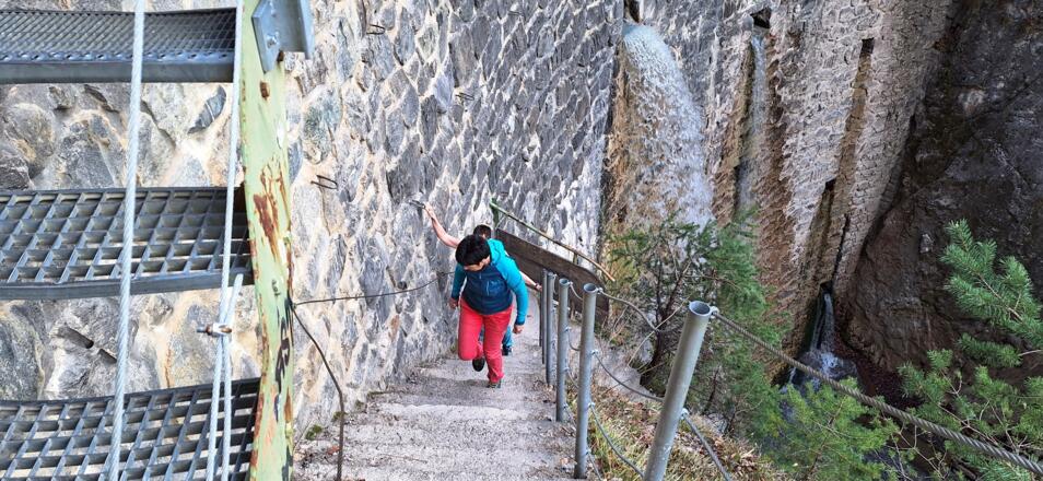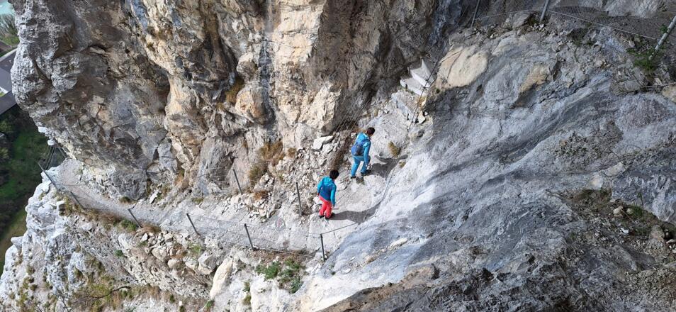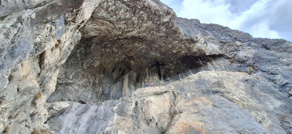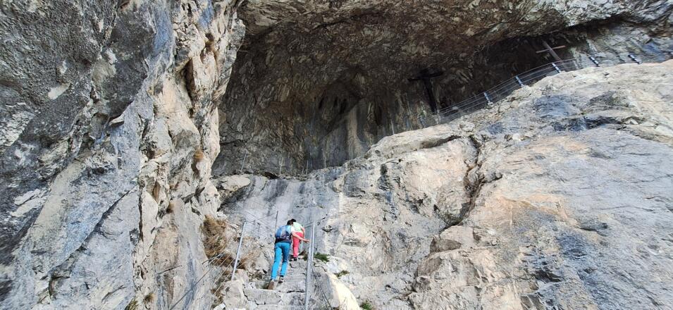 Es geht wieder bergauf: auf zahlreichen Tafeln entlang des Steigs kann man über Kaiser Maximilian I., die Geschichte und die Jagd lesen. Der Steinbruch wird auf einer gesicherten Terasse gequert. Dann geht es nach ein paar Serpentinen bestens versichert aber mit eindrucksvollem Tiefblick in die Martinswand zur Grotte. In der großen Felshöhle, die sich ca. 200m über dem Talboden befindet sich ein Holzkreuz mit dem betenden Kaiser.