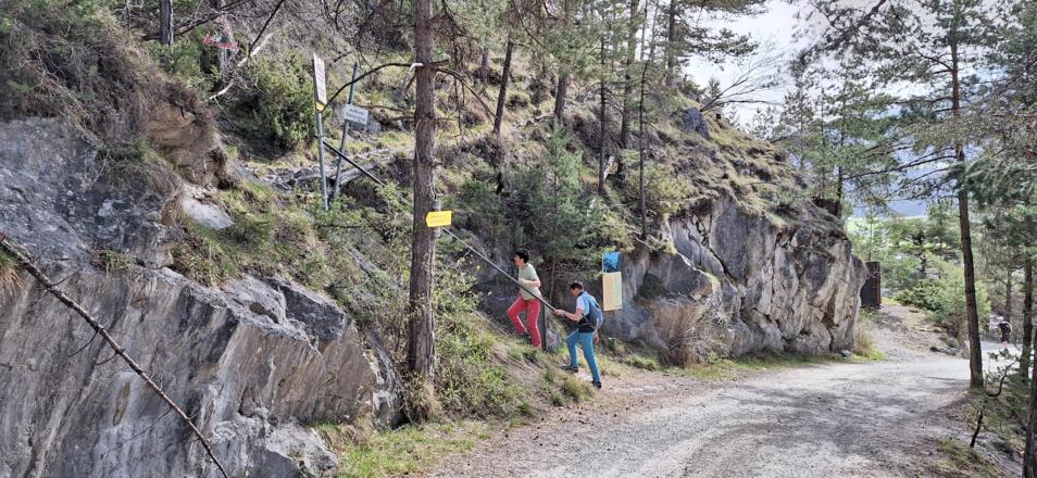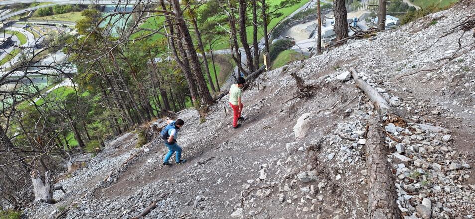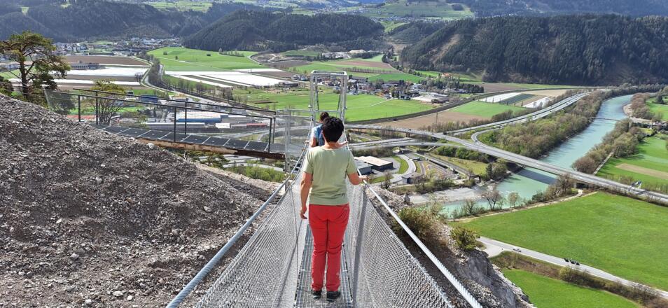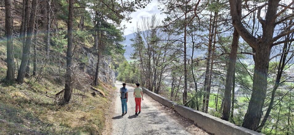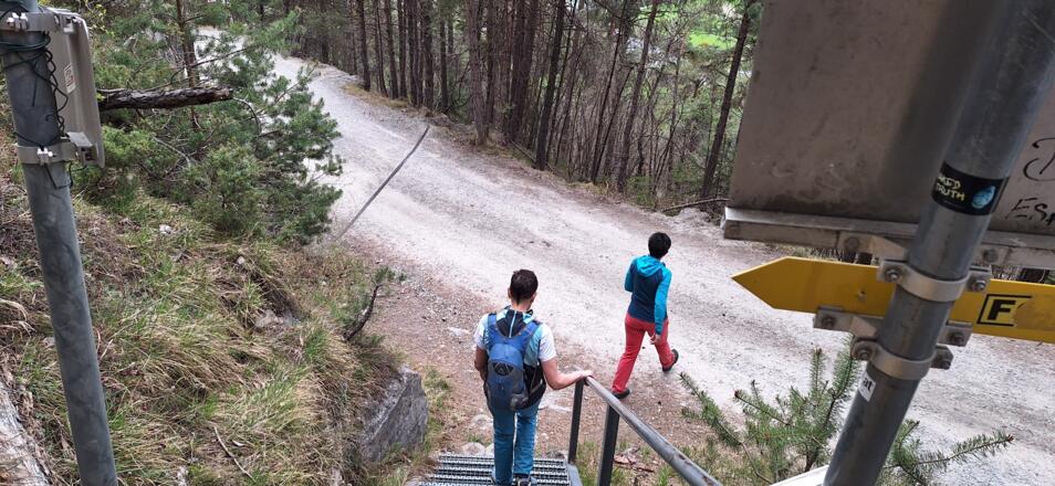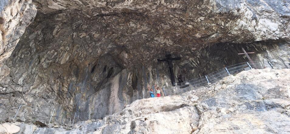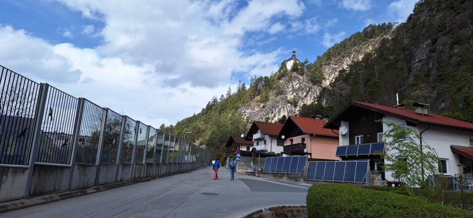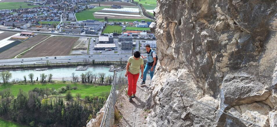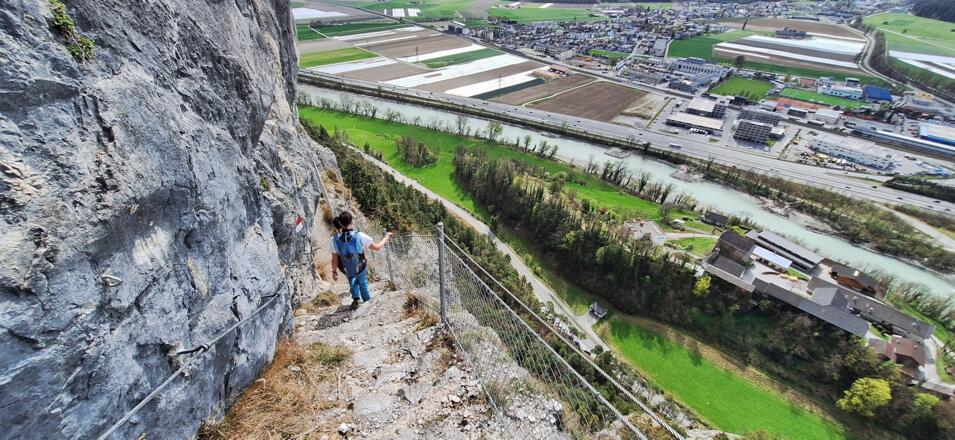 Es geht wieder bergauf: auf zahlreichen Tafeln entlang des Steigs kann man über Kaiser Maximilian I., die Geschichte und die Jagd lesen. Der Steinbruch wird auf einer gesicherten Terasse gequert. Dann geht es nach ein paar Serpentinen bestens versichert aber mit eindrucksvollem Tiefblick in die Martinswand zur Grotte. In der großen Felshöhle, die sich ca. 200m über dem Talboden befindet sich ein Holzkreuz mit dem betenden Kaiser.