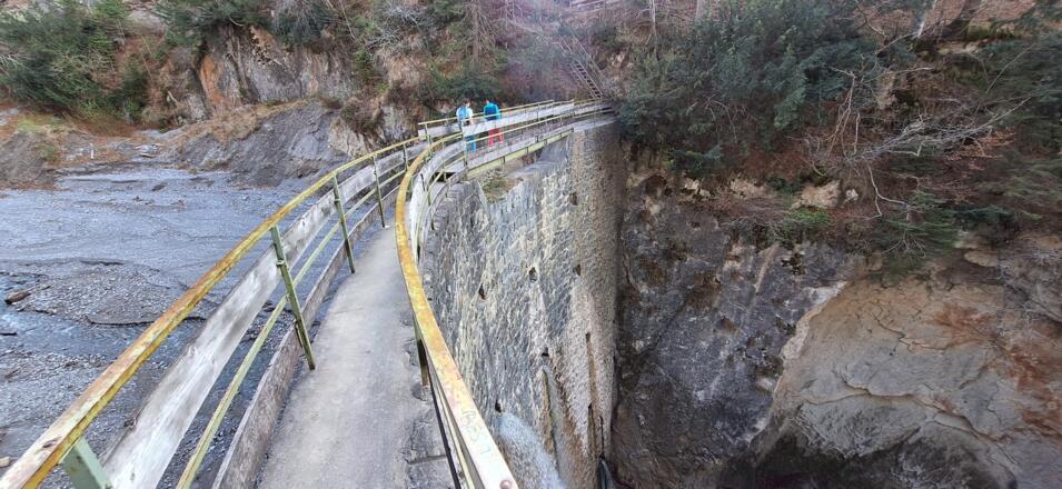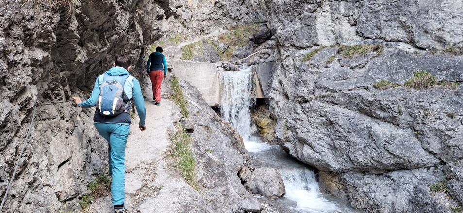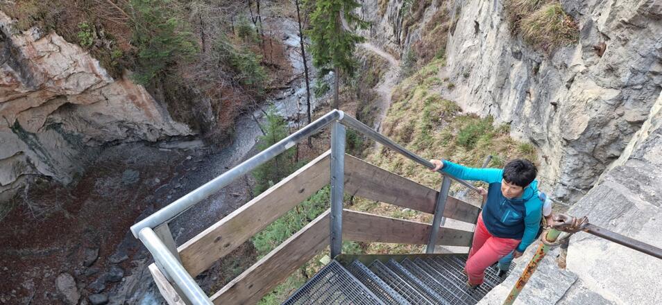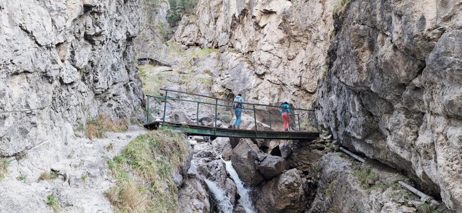 Auf einem schmalen Steig geht es durch die Ehnbachklamm, teils mit Stahlseilen versichert und mit einem Geländer versehen, bis zu einer hohen Geschiebesperre, die gequert wird. Auf einem Forstweg gelangen wir zur Fahrstraße ins Brunntal, auf der wir absteigen bis wir kurz vor dem großen Steinbruch bestens beschildert die Abzweigung auf den ebenfalls gut gesicherten Steig zur Kaiser Max Grotte nehmen.