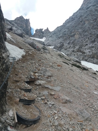 Streckenbeschreibung: Man startet bei der Pfeishütte und folgt dem Steig 221 (= Via Alpina) in östliche Richtung hinauf zum Stempeljoch. Auf einer Höhe von 2215 Metern hat man das Joch zwischen Pfeiser Spitze und Stempeljochspitze erreicht. Ab hier führt der Steig nun steil über eine Schotterreise hinab. ACHTUNG: Im Frühsommer liegt in der Stempelreise zum Teil sehr viel Altschnee, der am frühen Morgen sehr hart gefroren ist (hierfür Stecken und Grödel mitnehmen)! Nach etwa 140 hm Abstieg zweigt man linker Hand in den Wilde-Bande-Steig ein. Auch auf diesem Übergang liegen häufig Altschneefelder. Zunächst geht es unter den Ost- und Südflanken der Stempeljochspitzen, des Roßkopfes sowie des Großen und Kleinen Lafatschers annähernd Höhenlinienparallel in Auf und Ab Richtung Lafatscher Joch. Vor dem Lafatscher Joch (2081 m) steigt man noch einmal etwa 80 hm hinauf. Ab hier verläuft der Steig 222 (= Via Alpina) ansteigend Richtung Osten durch das Kleine und Große Speckkar. Die letzten Meter zur Bettelwurfhütte legt man zurück, während man die weitreichenden Blicke ins Halltal und ins Inntal genießt. Wie ein Adlerhorst thront die Hütte an der Südflanke des Kleinen Bettelwurfs.