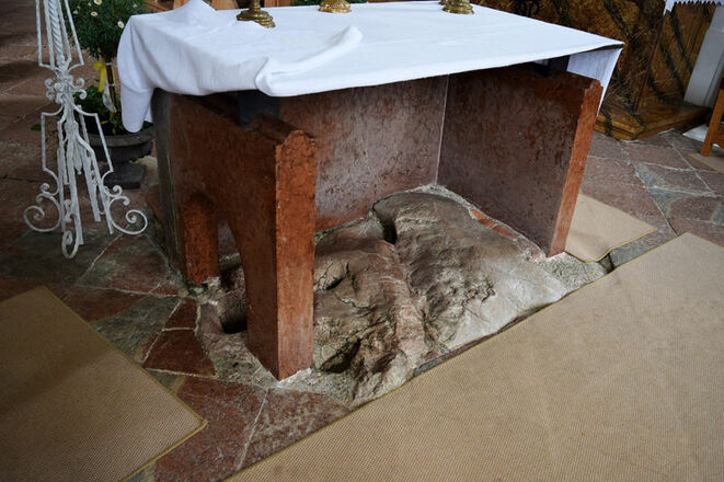 An der rechten Seite des Marmors ist ein kreisrundes Loch, ein sogenannter Schlupfstein zum Durchkriechen bei Rückenleiden, Kinderwunsch und sonstigen Beschwerden. Den Durchschlupf gibt es seit dem frühen 18. Jahrhundert. Es gibt Hinweise, dass die Kirche bereits in vorchristlicher Zeit ein Kultort war.