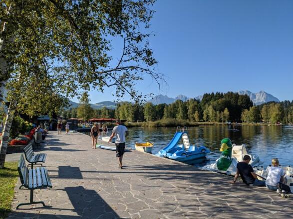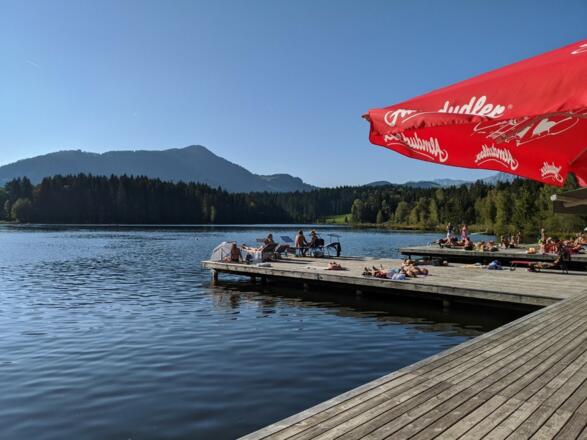 Schwarzsee – Naherholungszentrum und Krafttankstelle der Kitzbüheler. Wir lassen unsere Wanderung bei einem energiespendenden Sommerdrink auf der Seeterrasse ausklingen, tauchen unsere Füße ins