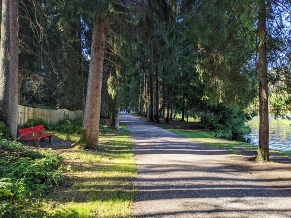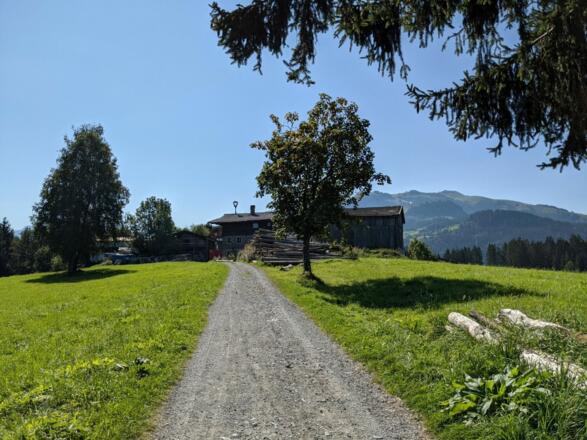 :: Über eine Asphaltstraße wandern wir den Steuerberg hinunter. Am Fuße des Hügels folgen wir der Beschilderung „Richtung Schwarzsee“. So gelangen wir zum Ausgangspunkt des KitzTrail BALANCE: dem