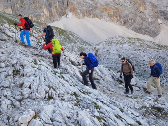 Nach ausgiebiger Brotzeit auf dem Münchner Haus, bestaunen der unzähligen Gipfel und beseelt von der einmalig schönen Aussicht stellt sich die Gretchenfrage: Ganz bequem mit der Seilbahn wieder zu Sonnalpin abfahren? Oder aber, wenn Kraft, Kondition und Wetter grünes Licht geben, doch lieber den gleichen Weg wie am Aufstieg absteigen?