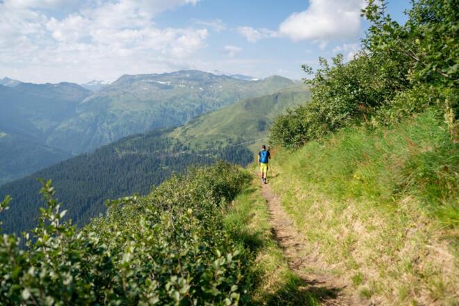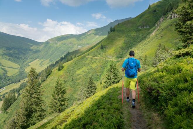 Beginn der Wanderung ist die Bergstation der Schlossalmbahn. Die Route führt über einen alten Verbindungsweg, den „Hermann-Kreilinger-Steig“ in Richtung Rockfeldalm (bewirtschaftet). Trittsicherheit und Schwindelfreiheit sind auf diesem Wegabschnitt unbedingt notwendig. Der Blick auf die Gadaunerer Hochalmen gegenüber lässt erahnen, dass viele dieser Almhütten im Sommer bewirtschaftet sind. Speck, Butter, Käse – da läuft das Wasser im Mund zusammen. Das treibt an. Auffallend sind die hochgelegenen Mähder, die jeden Sommer gemäht werden. Bäuerliche Kultur auf solch einer Seehöhe – beeindruckend. Viele Heustadeln säumen den Weg und der Duft von frischem Heu liegt in der Luft. Mit dem Sommerwind im Rücken geht es über saftige Almwiesen zu den Gadaunerer Hochalmen. Von hier aus ist der Hermann-Kreilinger-Steig gut zu sehen – die steilen Grashänge beeindrucken. Ebenso der Blick auf die Türchlwand und die Sieben Spitz ist imposant. Der Abstieg erfolgt über einen Pfad durch dichten Fichtenwald ins Angertal.
