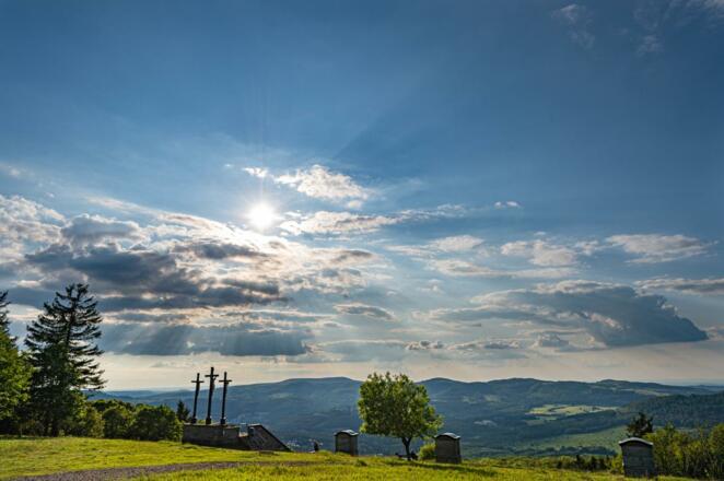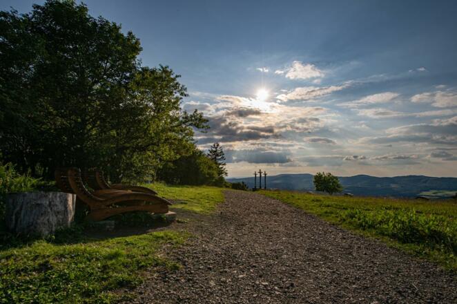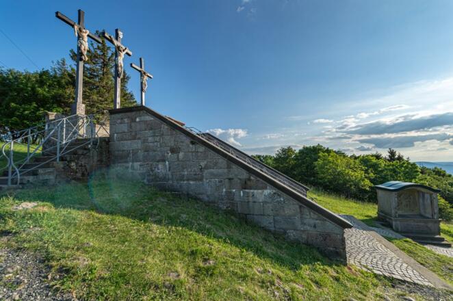 Die Kreuzigungsgruppe, das Wahrzeichen des Kreuzbergs, befindet sich unterhalb des Gipfels. Sie ist über den Kreuzweg mit 13 Bildkapellen (1710) oder einer langen, steilen Treppe vom Kloster Kreuzberg erreichbar. Die drei Golgota Kreuze bilden die 12. Station des Kreuzwegs, der dem Kreuzweg in Jerusalem nachempfunden ist. Von hier kann man einen wunderschönen Rundumblick auf die Rhönberge genießen. Das Kloster Kreuzberg befindet sich am Premiumwanderweg Extratour "Kreuzbergtour" .