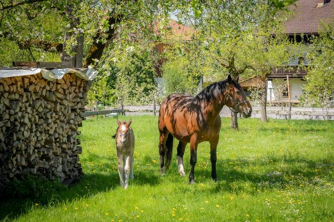 Gemütlich eingerichtete Ferienwohnungen mit großzügigem Balkon, direkt am Jenbach gelegen, laden zum Entspannen und Erholen ein. Die Ferienwohnungen befinden sich im 1.Stock des Nebenhauses eines ehemaligen Milchviehbetriebes, inmitten der wunderschönen Voralpenlandschaft von Bad Feilnbach. Der Kriechbaumerhof wird mittlerweile im Nebenerwerb mit Jungvieh und Pferden bewirtschaftet. Kutschfahrten direkt ab Hof sind zu vorgegebenen Terminen möglich. Hofeigene Streuobstwiesen direkt vor der Haustüre, dienen der Direktvermarktung und Weiterverarbeitung von frischem Obst und bieten vor allem zur Zeit der Baumblüte im Frühjahr ein besonderes Erlebnis. Über ein ausgedehntes Radwegenetz rund um Bad Feilnbach sowie ausgewiesene Mountainbike Strecken freut sich jeder aktive Radsportler. Eine abschließbare Fahrradgarage steht kostenlos zur Verfügung. Eine Wanderung zum Jenbachparadies oder zum Moorerlebnis Sterntaler Filze ist genauso gut vom Hof aus möglich, wie eine Bergtour auf einen der Hausberge mit den gemütlichen Almen. Das Warmfreibad ist zu Fuß innerhalb von 5 min. erreichbar. Ortszentrum mit Einkaufsmöglichkeiten, Vollsortimenter, Bäckerei und Café sind nur 500m entfernt.