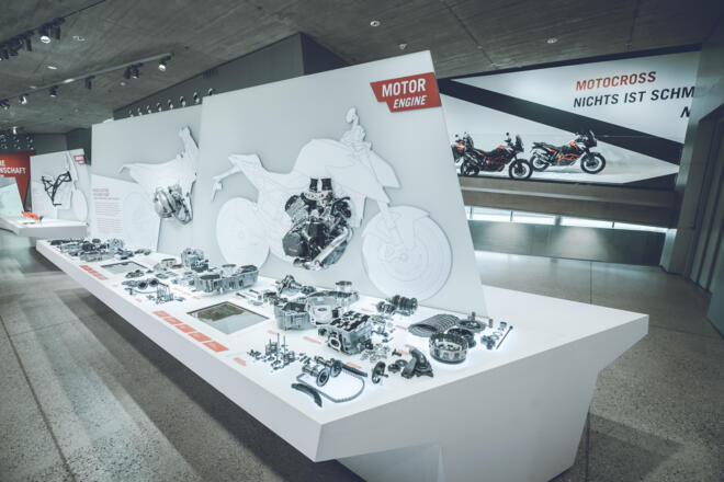 Auf einer nachgebauten Steilkurve liefern sich Street- und Offroad-Bikes ein Rennen und führen hinauf bis zum Höhepunkt der Ausstellung: die Heroes-Area. Besucher begegnen hier den mutigsten und erfolgreichsten KTM Werksfahrern aller Zeiten. Dabei taucht man in die Welt von KTM durch eine spektakuläre 120 Meter lange 360-Grad-Video-Installation ein. In der lebenden Werkstatt werden Oldtimer wieder zum Glänzen gebracht. Motorräder der ersten KTM Stunde bilden die Grundlage für die Arbeit des hauseigenen Mechanikers. Besucher können hautnah dabei sein, wenn die Bikes mit frischem Motoröl wieder zum Leben erweckt werden, und bei Interesse auch direkt Fragen an den Chefrestaurator stellen.