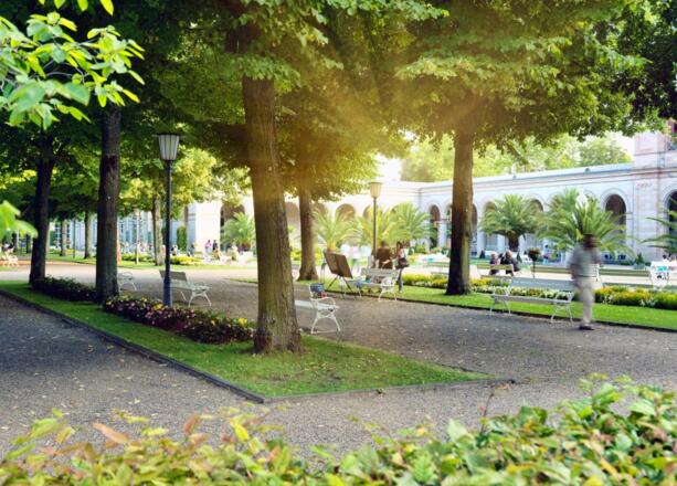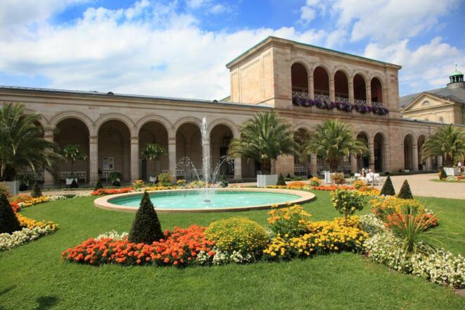 Im Kurgarten trifft mediterranes Flair auf große Geschichte. Gesäumt von einem Ensemble historischer Prachtbauten befindet sich der Kurgarten im Stadtzentrum Bad Kissingens. Doch wer an Trubel und Menschenmassen denkt, liegt falsch. Sobald Sie den Kurgarten betreten, werden Sie von seinem anmutigen Flair verzaubert. Meterhohe Phönixpalmen, plätschernde Springbrunnen und sprießende Blumenbeete sorgen dafür, dass sofort ein Gefühl der Entschleunigung eintritt. Zahlreiche Parkbänke bieten die Möglichkeit, im Kurgarten zu verweilen und den Blick schweifen zu lassen: Auf den Regentenbau, der mit dem Max-Littmann-Saal einen der besten Konzertsäle der Welt beheimatet. Auf den Arkadenbau, in dem sich heute unter anderem die Tourist-Information befindet, und auf die Wandel- und Brunnenhalle, in der die Heilwässer ausgeschenkt werden. Schon im 19. Jahrhundert kam hier Europas Adel und Aristokratie zusammen. Gleichermaßen ist der Kurgarten heute noch bei Gästen und Einheimischen beliebt. Im Sommer können Musikbegeisterte open air den Konzerten der Staatsbad Philharmonie Kissingen lauschen. Die Heilquellen laden ein, der Gesundheit etwas Gutes zu tun und gemütliche Cafés locken mit köstlichen Angeboten. Drei Mal jährlich werden die Beete den Jahreszeiten entsprechend neu angelegt und im Winter erstrahlt hier ein wahres Lichtermeer.