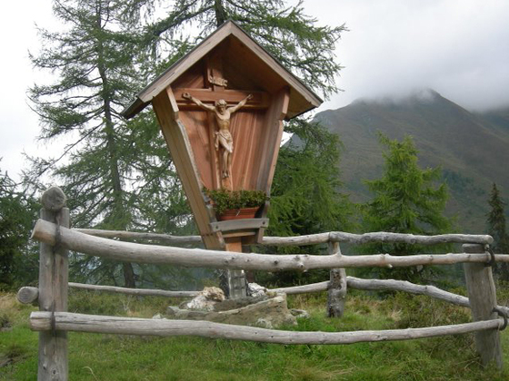 ÜBERGANG und ABSTIEG: Zurück bis rechts ein schwach erkennbarer Steig die steile Grasflanke durchschneidet. Auf diesem vorsichtig im steilen Gras in die Scharte (~2300 m) vor dem Geißkarkopf. Auf besserem Pfad nun sehr steil (I) hinauf auf den Gipfel des Geißkarkopfes (2384 m). Zurück zum Anstiegspfad um 2280 m und zur Schmalzscharte (2159 m) hinab. Dann rechts am markierten Weg zur Rastötzenalm (1743 m) und nach der Bachquerung wieder rechtshaltend am bekannten Anstiegsweg zum Schranken 1220 m hinab. 130 HM zusätzlich und 2 Std. Gehzeit.