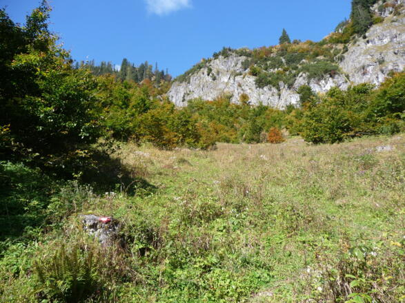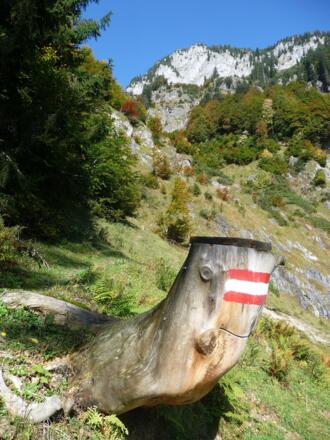 Anfangs (Weg 235) gehen wir kurz über eine geteerte Forststraße nordwärts, um dann über einen felsdurchsetzten Almwiesenhang an einem im Sommer versiegten Bachlauf rechtsseitig entlang bis zu einer Felswand anzusteigen. Die Felswand und deren auf der linken Seite sich anschließender "Wasserfall" umgehen wir großzügig mit einer Überquerung des Bachlaufs ca. 300 Meter westwärts und weiter am Waldrand ansteigend. Teilweise sind nur Markierungen an den Pfosten und Baumstämmen erkennbar. Danach folgt eine kurze Seilversicherung (5m), die jedoch ohne große Schwierigkeiten zu meistern ist.