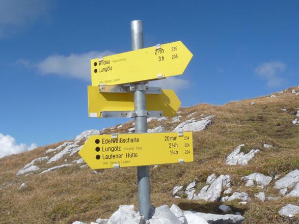 Von hier aus eröffnet sich bereits auch der Blick in Richtung Fritzerkogel und weiter im Hintergrund bei guter Sicht das Steinerne Meer sowie Hochkönig. Auf dem Sattel wandern wir kurz nordwärts weiter bis wir auf den Rücken zwischen den Hochkarfelderköpfen und den Weg (234) gelangen. Um auf den höchsten Hochkarfelderkopf (2219m) zu gelangen können wir uns einen kurzen Abstecher (10min) nach rechts (nordöstlich) gönnen. Der eigentliche Weg (234) unserer Tour in Richtung Laufener Hütte führt uns jedoch links weiter in Richtung Edelweißscharte. Hierbei passieren wir auch das Gipfelkreuz des südlichsten (niedrigeren) Hochkarfelderkopfs und gehen nun in Serpentinen über Wiesenmatten hinunter in die Edelweißscharte. Unter uns im Tennkessel sehen wir bereits unser Ziel, die Laufener Hütte auf ihrer felsigen Anhöhe über dem satten Grün des Almbodens. Wer nun noch einen weiteren Gipfel mitnehmen will macht in wenigen Minuten einen Abstecher auf den gegenüberliegenden Edelweißkogel ( 2030m) und trägt sich in dessen Gipfelbuch ein.