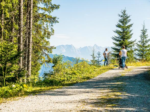 Kinderwagengerechte Abschnitte: Jeweils mit Start bei der Maiskogel-Bergstation zur Unterbergalm, zum Alpengasthaus Glocknerblick und zur Maiskogel Alm Ranch (jeweils 20 – 30 min.).