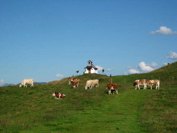 Mit der Gondel auf das Markbachjoch. Am Markbachjochhaus vorbei hinauf zur Kapelle. In östlicher Richtung zur "Kropfraderjoch-Alm" und weiter bis auf die Fahrstraße nach Hopfgarten. An den Bauernhöfen "Fleckl" und "Schlafbichl" vorbei, von dort links abwärts auf dem alten Weg zum "Penningdörfl". Von dort über "Rothenau" zurück nach Niederau.