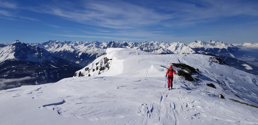 Der Morgenkogel ist ein Panoramaberg, der seinesgleichen sucht. Außerdem seltener begangen wie das benachbarte Pfoner Kreuzjöchl. Vom oft abgeblasenen Grat darf man sich nicht abschrecken lassen, die weiten Nordhänge bieten oft noch recht unerwartet tollen Pulver.
