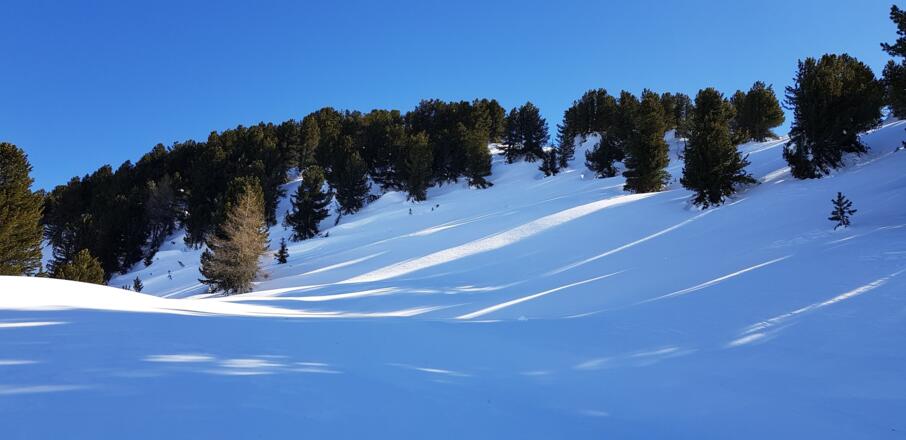 Die Nordhänge des Morgenkogel bieten bis spät ins Jahr hinein schöne Pulverhänge mit perfekter Neigung, wodurch sich auch die Lawinengefahr in Grenzen hält.