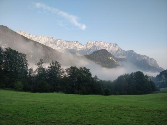 Auf dem Berchtesgadener Radstern-Ost (weißer Stern auf braunem Hintergrund) geht’s von der Watzmann Therme Richtung Marktschellenberg. Dann aufwärts über die Tiefenbachstraße und den verkehrsarmen Steinerweg in die Scheffau. Über den Linenweg geht es in die Oberau und weiter in Richtung Buchenhöhe. Wir überqueren die Rossfeldstrasse und fahren auf der Salzbergstraße zu den Kehlsteinwegen (Salzwand) bis zur Scharitzkehlalm. Die Westwand des Hohen Gölls wirkt hier gerade zu drohend auf den Radler. Bei der Weiterfahrt Richtung Hinterbrand und talwärts zum Ausgangspunkt liegt uns der Berchtesgadener Talkessel zu Füßen.
