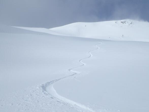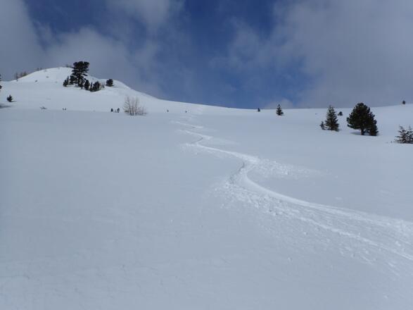Von der Karneralm aus wird die Mühlhauserhöhe eher selten bestiegen. Und doch bieten sich schöne Hänge für die Abfahrt an, die mindestens so zügig sind wie beispielsweise jene vom Kleinen Königstuhl. Bereits während des Aufstieges kann man sich anschauen, ob eine Einfahrt in die anfangs steilen Osthänge bereits zwischen der Mühlhauserhöhe und der kleinen Kuppe im Südkamm möglich ist. Das wird jedenfalls von der Wechtenbildung abhängig sein und wie sehr die Hänge hinunter in den Almkessel mit Triebschnee gefüllt sind.