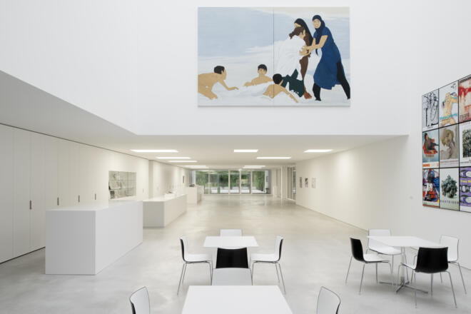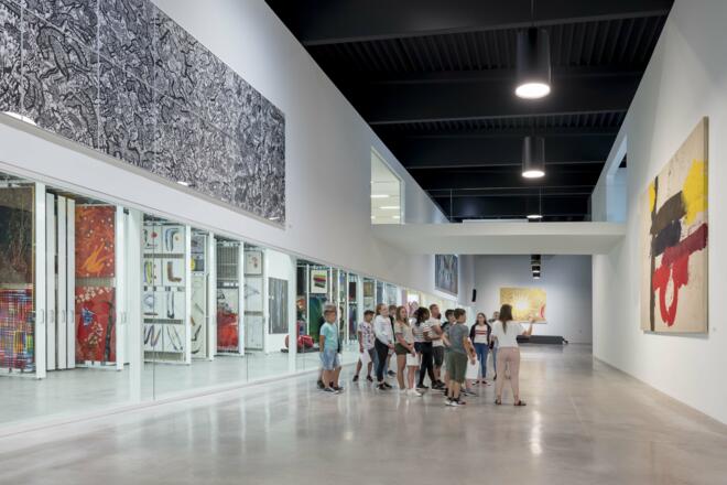 die neuen Bauteile in Weiß erstrahlen. Die funktionale Raumaufteilung umfasst einen großzügigen Eingangsbereich, durch welchen man in den Veranstaltungsraum mit dem angrenzenden „Herzstück“ des Museums – das Schaudepot – sowie den Kunstvermittlungsraum und den Salon im Obergeschoß gelangt. Die große säulenfreie Ausstellungshalle mit einer Fläche von 1.170 m² - in dieser Konstellation im näheren Umfeld einzigartig – und vier weitere Ausstellungsräume im Obergeschoß mit je ca. 200 m² komplettieren das Museumsgebäude als Kern des Hauses für die Kunstpräsentation.
