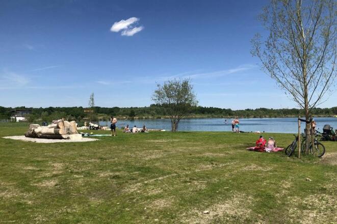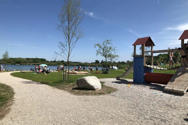 Der Höglinger Weiher ist ein ehemaliges Kiesabbaugebiet, Badeschuhe sind empfehlenswert. Die Liegewiese ist schön angelegt mit Sitzblöcken und Grillstellen.