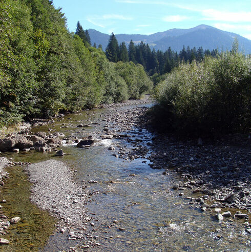 Die Bolgenach ist auf weiten Strecken ein noch ungezähmter, wilder Gebirgsfluss. Sie entspringt unterhalb des Riedbergerhorns (vgl. Tour 10), passiert Balderschwang und mündet südlich von Sulzberg in die Weißach. Auf gerade einmal 26 Kilometer Länge überwindet sie einen Höhenunterschied von 600 Metern – und trägt entsprechend viel Energie in sich.