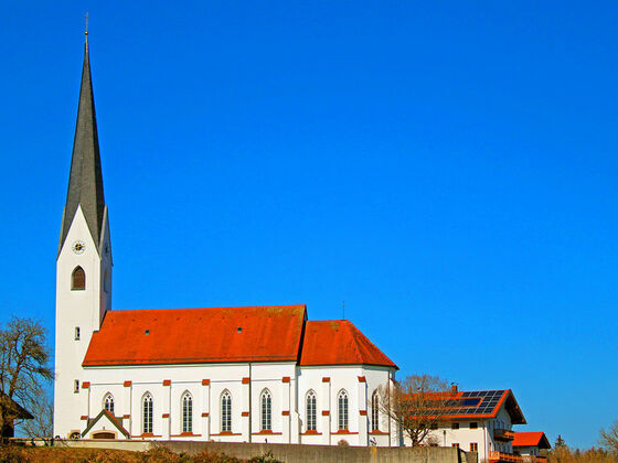 An der Kreuzung am Reitstall biegen wir rechts Richtung Breitbrunn ab und fahren auf der Mooshappener Straße bis zum Rathaus von Breitbrunn. Der Naturweg führt uns hier nach links auf die Eggstätter Straße zum idyllisch gelegenen Dorfweiher mit Blick auf die Barockkirche.