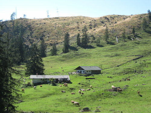 Diese Tour sollten Sie so planen, dass Sie von Sachrang mit dem Bus zurückfahren können oder Sie einen 2. PKW dort parken. Sie starten zu dieser 7- stündigen Bergtour in der Schlossbergstraße, biegen links in die Zellerhornstraße ein und folgen dieser bis zum Ortsteil Hammerbach - auf geschichtsträchtigem Boden. Bis 1879 waren hier die Hohenaschauer Hammerwerke in Betrieb. Vorbei am unteren Wasserfall geht es bergan und Sie sehen hinunter auf das letzte am Hang gelegene Haus, den sogenannten "Drahtzug". Wenn sich der 26er und 10er Weg mitten im Wald auf einer Höhe von 900 m trennen, biegen Sie links (S) ab und folgen dem leicht ansteigenden Forstweg bis zur Lichtung der Elland-Alm (Stempelstelle auf 989 m Höhe). Sie blicken auf das Zellerhorn und auf das Priental bis zur markanten Kampenwand.