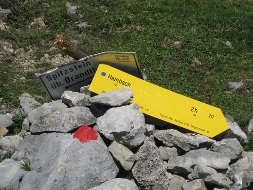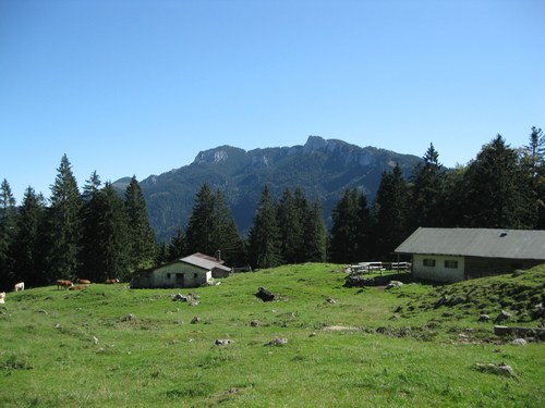 Dann geht es zurück, an der geschlossenen Klausen-Hütte vorbei in Richtung Süden (2 km) über baumloses Weidegebiet zur Feichten-Alm (bei Nebel Orientierung an rot markierten Steinen) und hinauf durch Latschenfelder und Felsgestein an der bayerisch-tiroler Grenze, den Brandelberg (1515 m) hinauf – eine reizvolle Gratwanderung. Auf und ab geht es weiter, und vor Ihnen taucht das Gipfelkreuz des Spitzsteins (1596 m) auf. Jetzt passieren Sie die mächtige, senkrecht abstürzende Spitzsteinwand auf ihrer Ostseite, erreichen den Sattel und mäßig bergab geht es an der Auer-Alm vorbei Richtung Westen auf das ganzjährig bewirtschaftete Spitzsteinhaus (Stempelstelle) oder die Altkaseralm auf Tiroler Territorium zu. Hier können Sie rasten oder den Gipfel des Aussichtsberges Spitzstein (1-1,5 Std. Auf- und Abstieg) erklimmen. Der 10er Weg endet am Spitzsteinhaus. Nach Sachrang nehmen Sie nun unterhalb des Gasthauses den Weg Nr. 6 Richtung Süden (links), und vorbei an der Gogl-Alm und Mitterleiten erreichen Sie Ihr Tagesziel Sachrang.