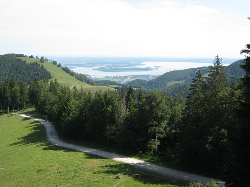 Sie lassen Aufham hinter sich, gehen bergauf bis zum Wasserhochbehälter und überqueren nach diesem die Forststraße und die Skiabfahrt. Folgen Sie weiter bergauf dem Ziehweg und überqueren Sie zum 2. Mal die Skiabfahrt an der Liftstation am Kaltwasserl, um dann nach einigen Minuten Gehzeit auf den geteerten Almwirtschaftsweg zu stoßen. Kurz nach dem Kapellerl verlassen Sie die Straße, um ein Stück die Abfahrt in Richtung Gori-Alm emporzusteigen und den Ausblick auf den Chiemsee zu genießen. Sie erreichen die Alm und weiter geht es wieder auf dem Fahrweg bis zur Steinling-Alm und SonnenAlm vor der Bergstation der Kampenwandseilbahn (wer sich den Weg verkürzen möchte, kann mit der Seilbahn eine Bergfahrt nehmen) Sie sollten eine der beiden Almen zum Rasten nutzen, denn es liegt noch ein weiter Weg vor Ihnen. Nach ca. 3-stündigem Aufstieg, zuletzt auf dem gut gesicherten Panoramaweg nach SW bis hinüber zur SonnenAlm und Bergstation der Kampenwandseilbahn, verlassen Sie den Sattel, um den Abstieg Richtung Dalsen-Almen zu beginnen. Ca. 1,5 Stunden folgen Sie einem immer schmäler werdenden Pfad, vorbei an der Hofbauernalm und erreichen die Dalsen-Almen, die auf 1050 m auf einem Sattel zwischen der Kampenwand und dem Weitlahnerkopf liegen. Sie überqueren eine Forststraße und lassen die Almen ostwärts hinter sich liegen. (Wem es nun reicht, der kann hier bequem ins Priental nach Hainbach absteigen). Nun geht es wieder 2 km steil aufwärts. 600 Höhenmeter müssen Sie auf die kurze Distanz bis zum Weiterlahnkopf (1615 m) überwinden. Zuerst durch baumfreies Gelände, dann ca. 1/3 des Aufstiegs durch schattenspendenden Bewuchs, und Sie erreichen unterhalb des Gipfels einen felsigen Steig, der mit einem Drahtseil gesichert ist und bei nassem Wetter sehr glitschig sein kann (nur für Geübte!). Die Aussicht vom Weitlahnerkopf mit seinem Gipfelkreuz belohnt Sie für die Anstrengung! Jetzt geht es nicht mehr so anstrengend weiter zur Roßalm - mit 1731 m die höchstgelegene bewirtschaftete Alm in den bayerischen Alpen - die zw. dem Roßalpenkopf und den Aschentaler Wänden liegt. Nach einer Stärkung folgen Sie dem – Blumen umrahmten wenig bergigen - Weg in Richtung Süden zum Geigelsteingipfel. Hier geht es wieder steil durch ein Latschenfeld bergauf und Sie stehen bald am Gipfelkreuz des Geigelsteins (1808 m) und genießen atemberaubende Rundum-Ausblicke.Ein Stück geht es den eben benutzten Weg bergab, dann aber den Pfad hinunter zur Oberkaseralm und Priener Hütte. Dort treffen Sie auf den Weg Nr. 3. Sie folgen dem Almwirtschaftsweg ins Tal, vorbei an den Abzweigen zur Schreck- und Acker-Alm und erreichen die Tal-Almen. Hier biegen Sie rechts ab, um direkt neben der Hütte auf den alten Geigelsteinweg zu treffen und ihm weiter zu folgen, bis er wieder in den Almwirtschaftsweg mündet. Diesem folgen Sie bis zu Ihrem Zielpunkt, dem Parkplatz Geigelsteinaustieg bei Sachrang.