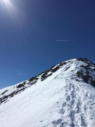 Dort angekommen steigen wir vom Skidepot zuerst wenig rechts in die Flanke um dann wieder nach links auf den Grat zu gelangen. jetzt sind es nur noch ein paar Meter zum Gipfel.