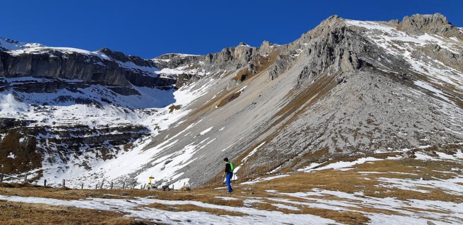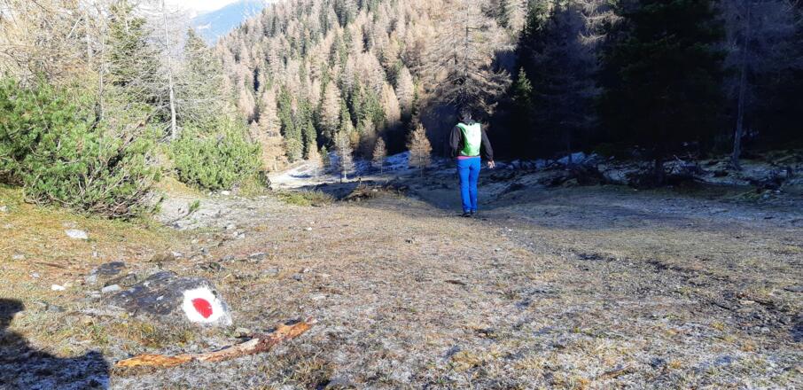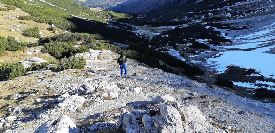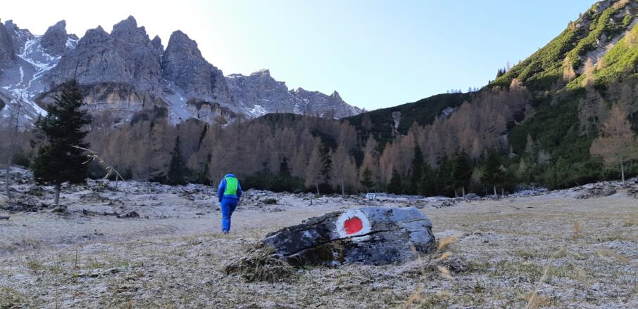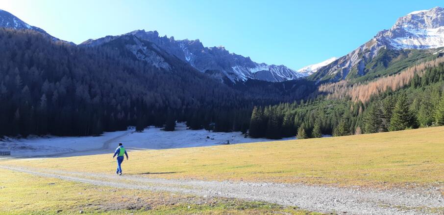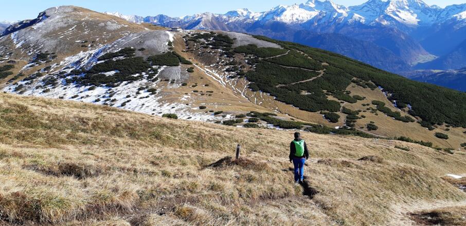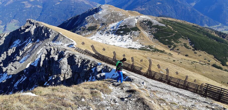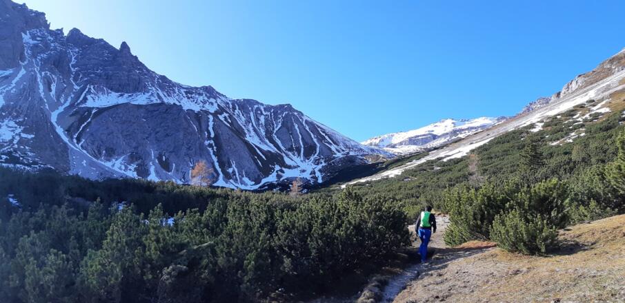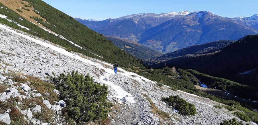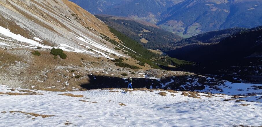 Abstieg: Vom Gipfel in östlicher Richtung über die Kalbenjochmähder hinunter bis zur Einsattelung zwischen Peilspitze und Blaser (ca. 100 Hm unterhalb der Blaserhütte). Dann links in nördlicher Richtung durch flache Mulden und zum letzten steilen Abstieg ins "Lange Tal". Talauswärts und kurz vor der Mautstraße links zur Ochsenalm und zurück zum Ausgangspunkt.