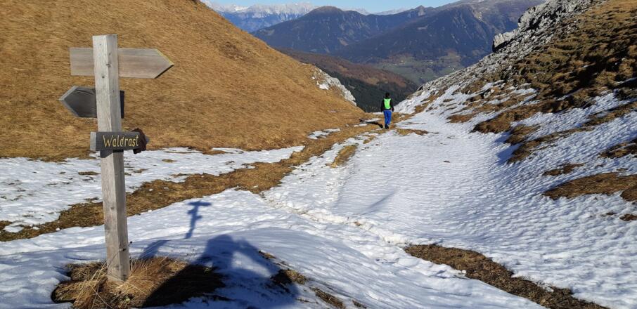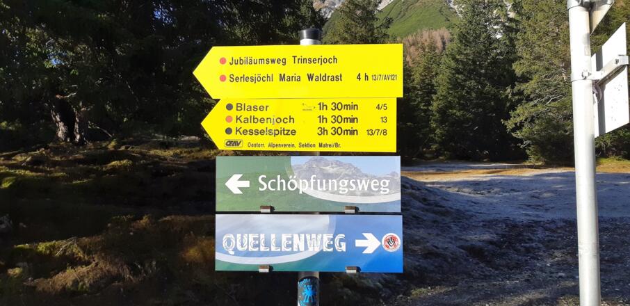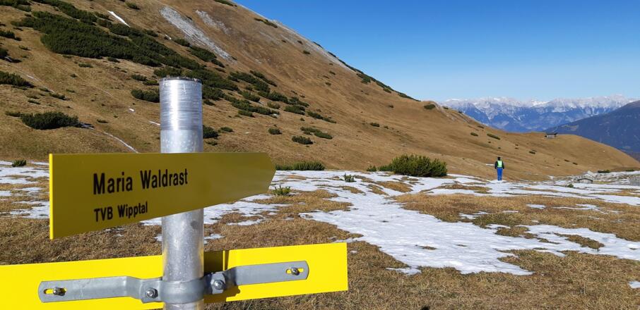 Auf der A13 Brennerautobahn bis Ausfahrt Matei am Brenner. Nach der Ausfahrt auf der Bundesstraße wieder 1,3 km zurück bzw. Richtung Norden, bis links die Abzweigung nach Maria Waldrast angeschrieben ist. Auf der Mautstraße bis ca. 500 m vor Maria Waldrast. Parkbuchten befinden sich am Straßenrand.