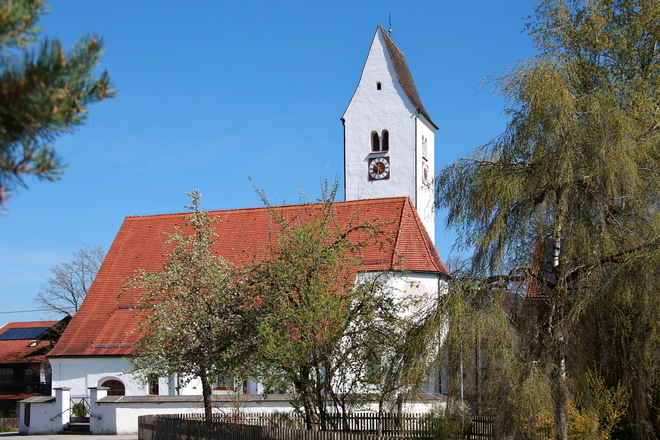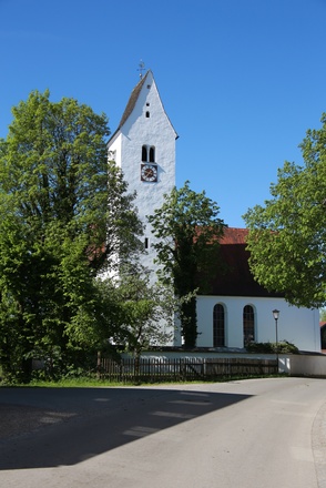 Mittelalterliche Anlage mit romanischem Turm. Hochaltar aus Stuckmarmor. 1746 nach Vorbild oder Einfluß von Dominikus Zimmermann errichtet.
