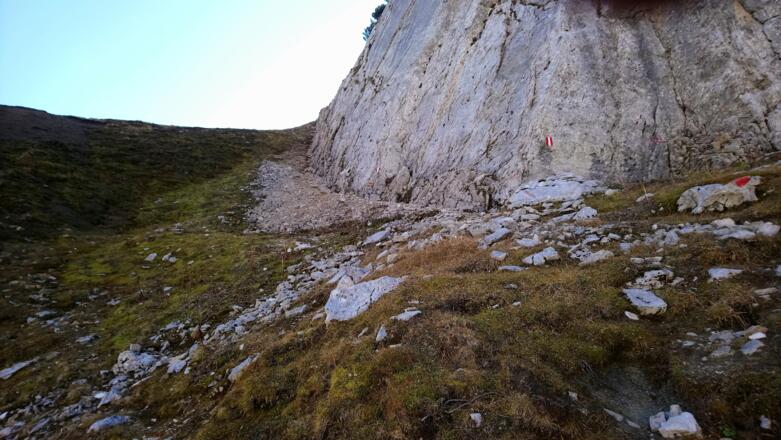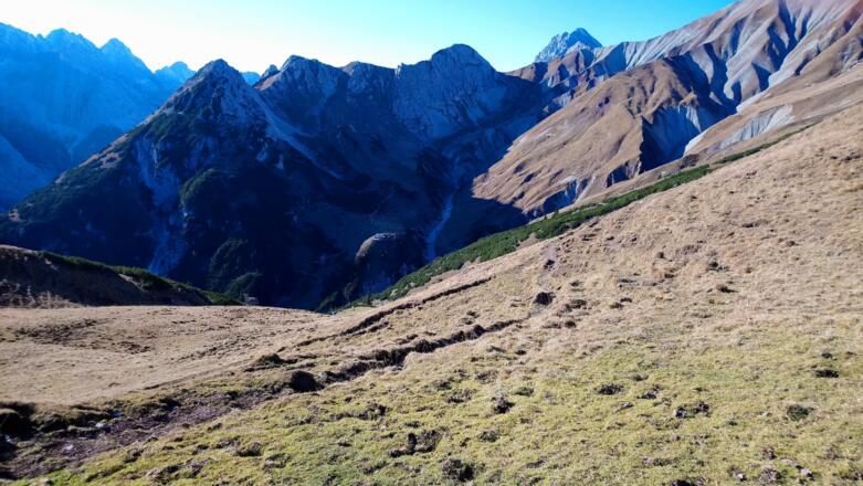 Abstieg: wie Aufstieg, oder den Gipfel überschreiten und nach Norden zu einem Sattel mit Rastbank absteigen, das weite Kar zum Steinernen Hüttl queren, zur Tillfussalm absteigen und am Ganghoferweg vorbei an der Gaistalalm zurück zum Parkplatz.