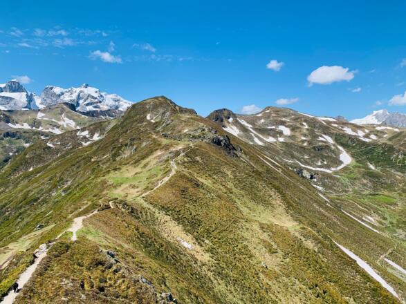 Der Golmer Höhenweg mit den Drei Türmen im Hintergrund
