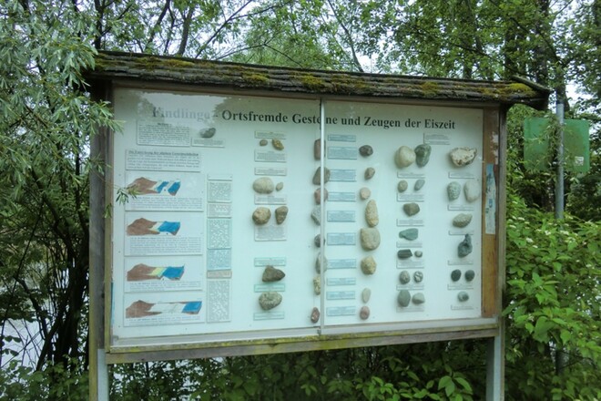 Ausgangspunkt ist die Rimstinger Pfarrkirche. Wir folgen dem Wegweiser "Rundweg zum Chiemsee" und genießen den herrlichen Ausblick auf den Chiemsee und die dahinter aufragenden Berge. Nach der Bahnunterführung wandern wir an der Prien entlang bis zur Mündung, wobei uns uralte Gesteine verschiedener Größe und Art begleiten. Es handelt sich um sogenannte "Findlinge", die während der Eiszeit auf dem Rücken der Gletscher in unsere Gegend transportiert, danach mit Geröll überschüttet und nun beim Häuserbau wieder zutage gefördert wurden. Auf dem Rückweg können wir hinter dem Strandkiosk auf dem romantischen Wanderweg direkt am See entlang weitergehen, bis wir auf den Chiemsee Rund- und Radweg stoßen, der uns wieder zur Prien zurückbringt, von wo aus es rechts nach Rimsting hinauf geht.