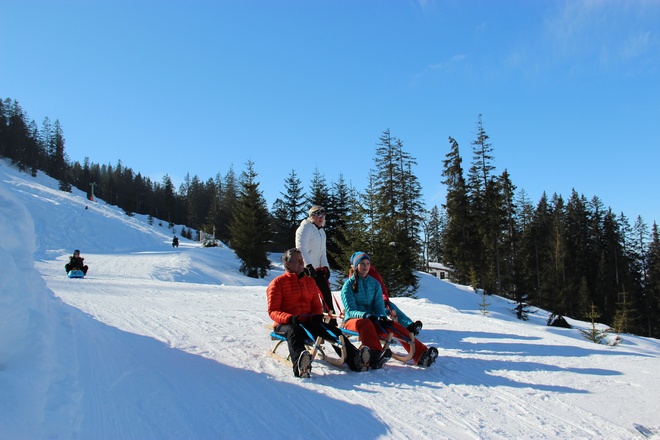 Winterwandern mit einer rasanten Abfahrt auf dem Schlitten kombinieren, ganz leicht im Tannheimer Tal.