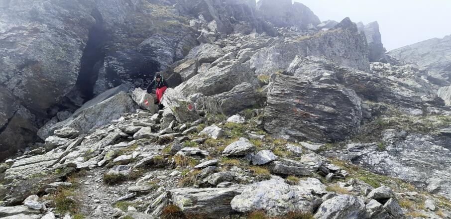 Steilstufe beim Aufstieg zum Kamm, der Weg durch das Blockgelände ist recht gut markiert, Absturzgefahr besteht nicht.