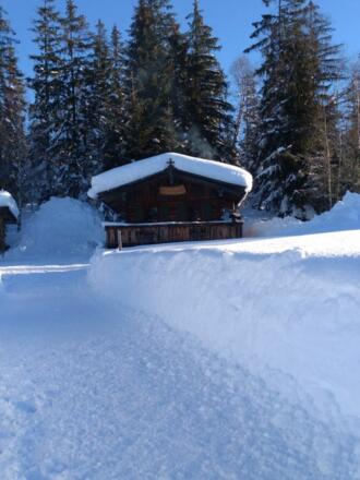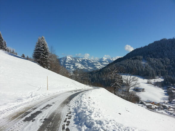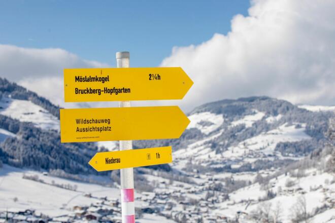 Kurz vor dem Hotel biegt der Winterwanderweg (beschildert) links ab und führt direkt am Auenweg Richtung Osten. In der Mitte des Weges befindet sich ein Spielplatz für die Kleinen.