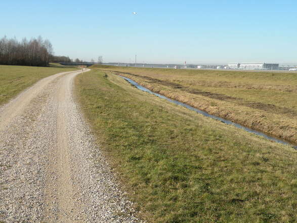 Nun biegen wir rechts in die „Freisinger Allee“, folgen dem Straßenverlauf vorbei an der Deutsche Post AG und biegen dann links in die „Nordallee“ ein. Es geht kerzengerade ostwärts, zu unserer Linken passieren wir das Gebäude der Deutschen Flugsicherung sowie die Werkstätten, Lager und Unterstellanlagen des Flughafen München, bis wir schließlich am Besucherpark und damit am Ausgangspunkt unserer Tour wieder ankommen.