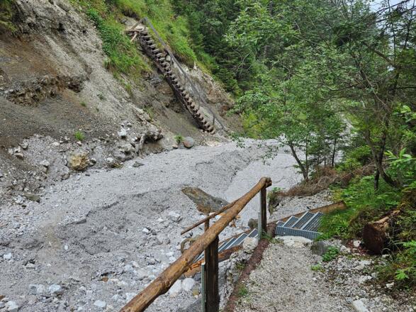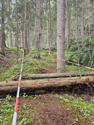 Auf einem Forstweg leicht abwärts talauswärts zurück zum Kriegerfriedhof (bzw. Adventure Park) nahe der Bundesstraße. Hier zweigt der "Kreuzweg" zum Alpengasthof Sonnenstein ab. Der Weg ist einfach zu begehen, gefahrlos und gut beschildert. Es gibt eine Bachüberquerung und eine kurze steilere Passage mit einigen Kehren. Nach zwei Drittel des Weges habe ich einen Windwurf passiert. Hier wird der Weg kurz nach links umgeleitet. Der Gasthof Sonnenstein ist nach ca. 1 - 1,5 h erreicht.