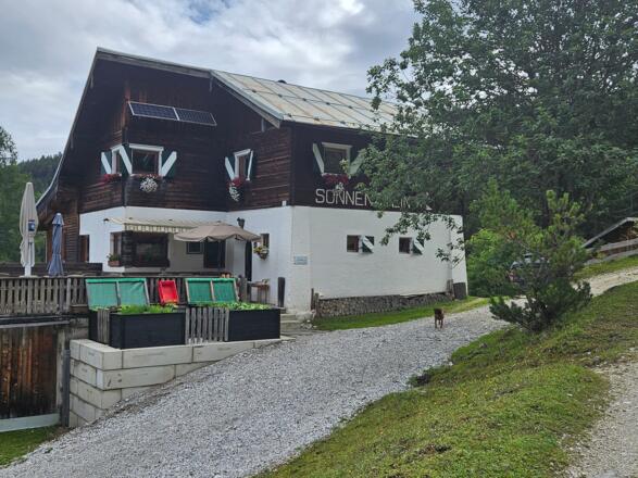 Beim Gasthof Sonnenstein kann man auf Terrasse sitzen, eine Kleinigkeit essen und die Aussicht ins Tal genießen.