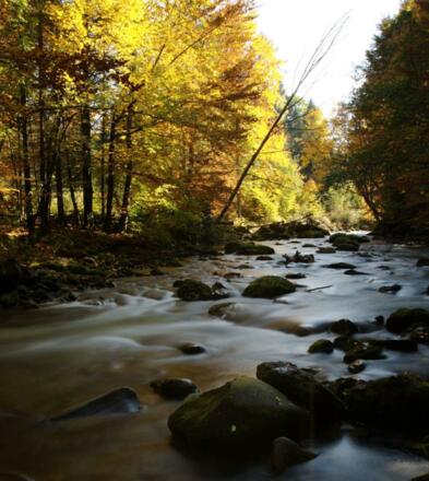 Von dort fahren wir auf einem Schotterweg durch den Naturpark Allgäuer Nagelfluhkette bergab nach Gunzesried. Danach radeln wir entlang der Gunzesrieder Ach zum Haldertobel, wo wir eine wildromantische Schlucht mit Wasserfällen, Strudeln und tiefen Gumpen erleben.
