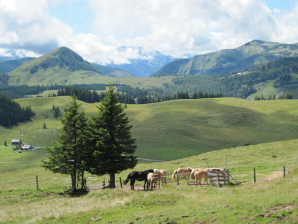 Kurzer Anstieg und langer Abstieg auf Forststraßen, markierten Almwegen und Waldpfaden, zuletzt wandern Sie auf einem ebenen Promenadenweg.