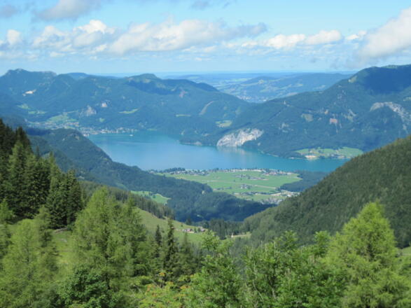 Nun folgt wieder eine eher erholsame Wegetappe. Erst geht’s sanft durchs Weideland der Postalm bergan und danach relativ gemüt-lich durch Waldhänge bergab. Gar-niert ist die Route mit ein paar steinigen Passagen und dem Blick zu schroffen Bergen. Und zum Schluss erwartet Sie ein Spaziergang durch ein wertvolles Moorbiotop am Wolfgangsee.
