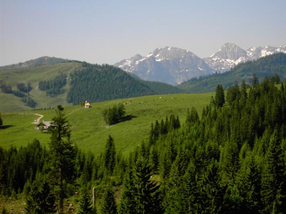 Von der Huberhütte am westlichen Rand der Postalm wandern Sie auf dem Weg Nr. 840 weiter und unter einem Lift durch zum Parkplatz 3 am oberen Ende der Postalm-Mautstraße. Von dort lohnt sich der kurze Abstecher zur historischen Postalmhütte neben ihrer kleinen Kapelle. Sie geht auf das Jahr 1853 zurück und gehörte damals dem Postwirt aus Bad Ischl – so ging der Name schließlich auf das ganze Almgebiet über. Der Weg zum Wolfgangsee führt dagegen links auf einer Almstraße mit der Markierung Nr. 877 zu den Wiesleralmen (1.361 m) im nördlichen Bereich der Postalm. Zwischen der Wiesler- und der Schafbergblickhütte gehen Sie auf der rechts abzweigenden Straße etwa 350 m Richtung Thoralm. Dann führt der Wanderweg Nr. 877 mit der Beschilderung „Niedergadenalm – Strobl“ links durch den Wiesenhang zum Thoralmsattel (1.492 m) hinauf.