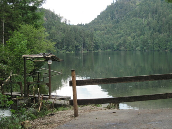 Auf der Schneiderwirtstraße über den Schöffaubach. Bei der Abzweigung der Nussensee-Zufahrtsstraße und auch bei der gleich darauf- folgenden Gabelung bleiben Sie geradeaus. Erst nach der Brücke über den Nussenbach biegen Sie rechts ab und wandern auf der alten, geschotterten Straße durch einen schluchtartigen Waldgraben zum Nussensee (604 m) hinauf. Dort angelangt haben Sie die Möglichkeit, nach rechts abzuzweigen und das waldumsäumte Berggewässer südseitig zu umrunden.
